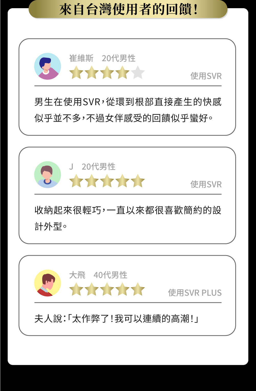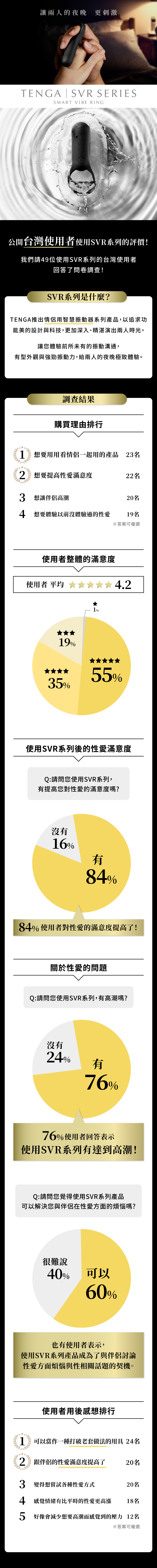 我們收集了49位使用過TENGA SVR系列產品的人的誠懇意見。